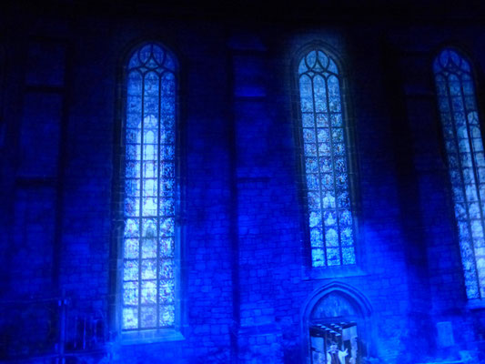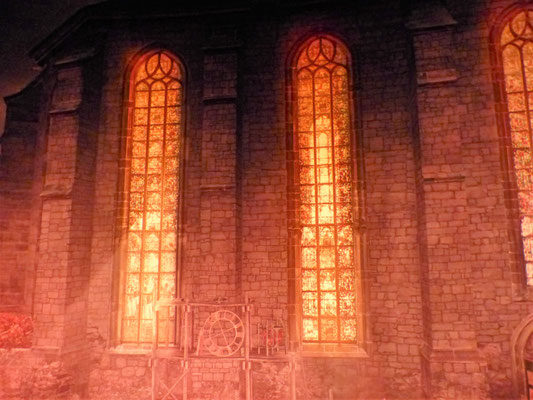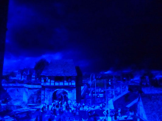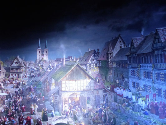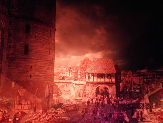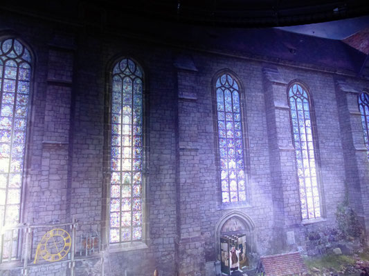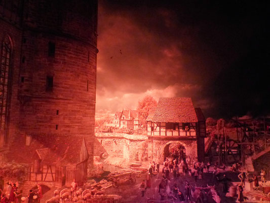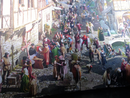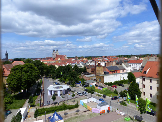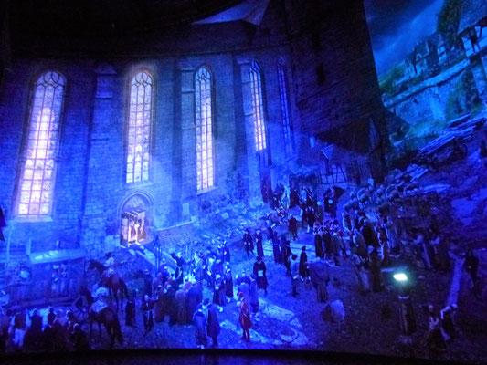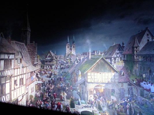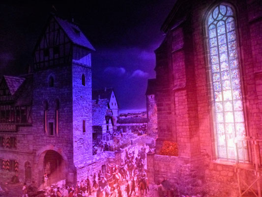 Das absolute Highlight in Wittenberg ist das Panorama von Yared Asisi. Ein großer zylindrischer Bau (wie ein Gasometer) beherbergt ein Rundbild über mehrere Stockwerke zu Leben und Zeit Luthers. Irre viele Details sind da zu entdecken, während wir uns langsam in der Runde bewegen. In der Mitte steht ein großes Gerüst, das auf zwei weitere Ebenen führt. Zwischendurch wechseln Licht, Wetter und Geräusche. Faszinierend.